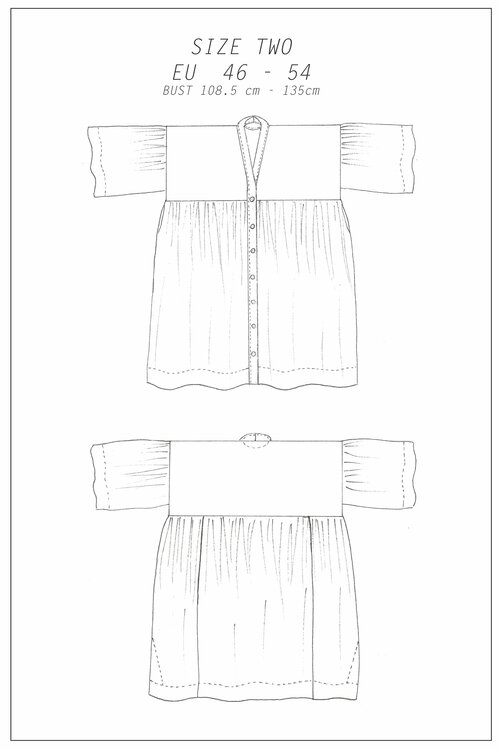 Gather Dress, Zero-Waste Pattern from Birgitta Helmersson is a ‘1 size fits this range’ zero-waste sewing pattern which is available from Bust: 108.5cm – 135cm / 42 1/2 – 53 1/2 inches (there’s also another pattern that’s fits a smaller size range).